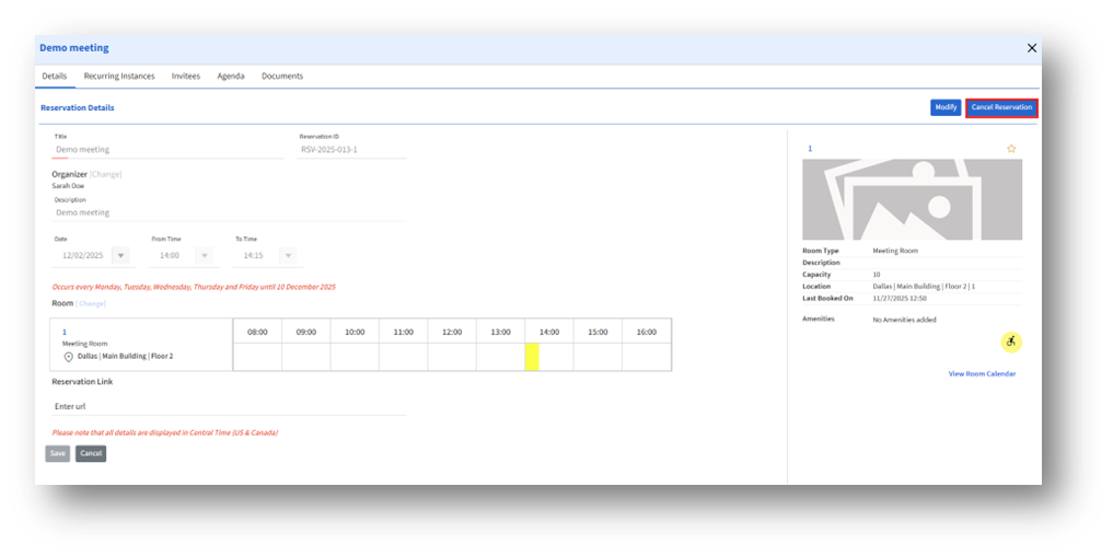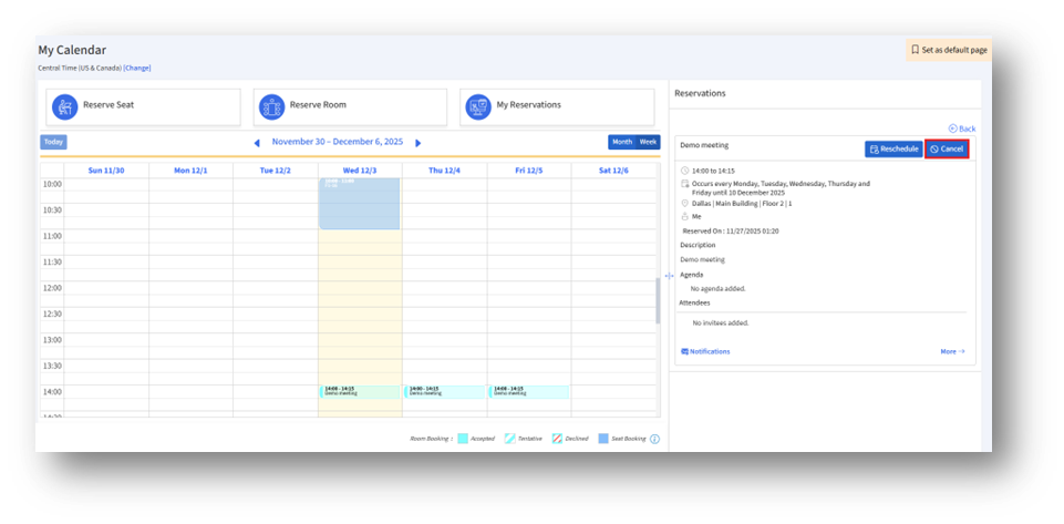 You can cancel any scheduled room reservation directly from the My Calendar or from the reservation details panel. Follow the steps below:
