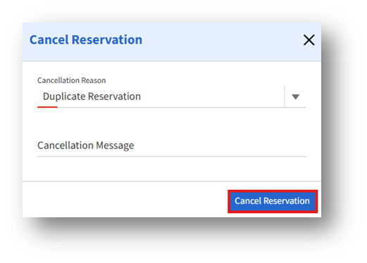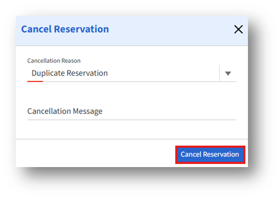 Select a Cancellation Reason, add a message if needed, and click Cancel Reservation to complete the process.