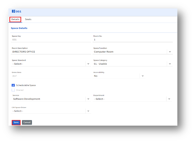 2. Clicking the Edit button opens the Details page. The admin can add a room number, edit the details, and click Save.