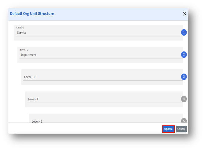 2. Then, the “Default Org Unit Structure” page appears, and the admin can add up to five levels and can give desired names to each level.