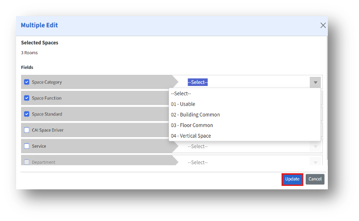 How can I edit multiple space details? Updating multiple space details 1. If multiple rooms are selected, clicking the Edit button opens the “Multiple Edit” page. 2. Select the fields to edit and choose from the drop-down list across the field. After editing, click the “Update” button.