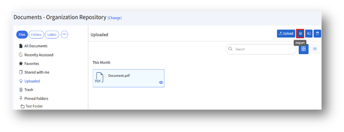 To import a document, click the “Import” button under the Uploaded section in the Files/Folders tab.