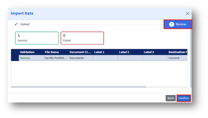 If there are any errors in the file, they will be displayed as errors under Validation, as shown above. Clicking the “Back” button returns the user to the Import page, where they can upload the correct file and then click the Next button to proceed to the Review page. Then, click the “Confirm” button to import the data. Click the Close (X icon) at the top right of the page to close the Import Data page.
