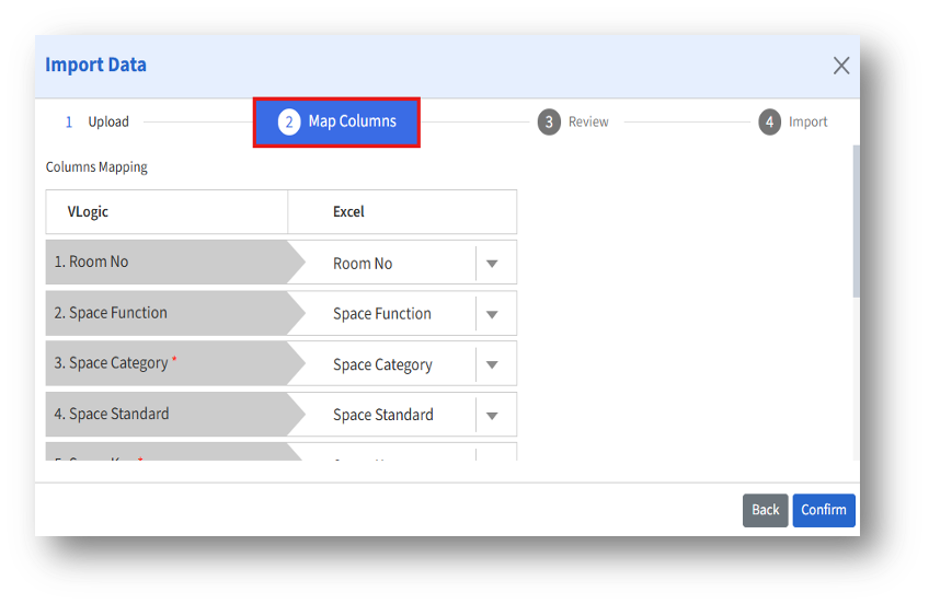 3. In the “Map Columns” section, the Space details in “Excel” fields should match the “VLogic fields.”
