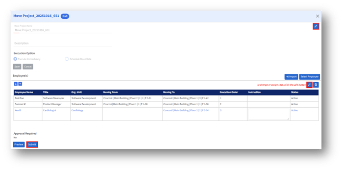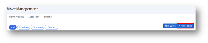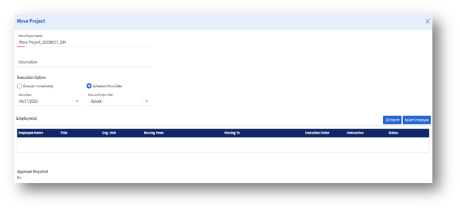 The Move Project page is designed to streamline and manage employee relocation activities within the organization. It enables admins to create move projects, define execution timing, add and import employees, set move details, and track move progress.