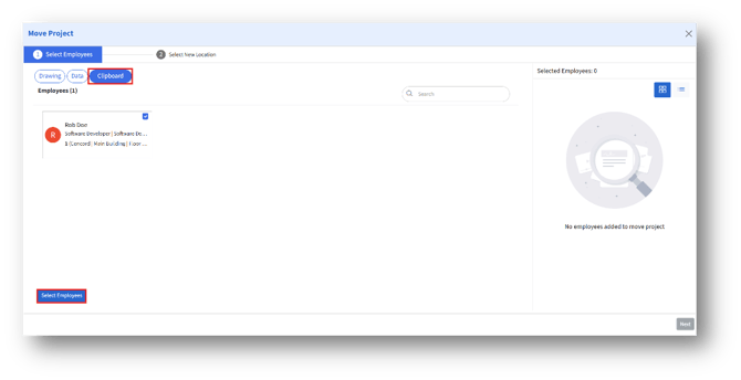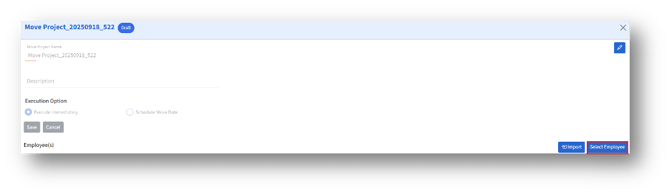 The "Select Employees" step is the first stage in the Move Project workflow. This step enables users to identify and select employees who need to be relocated from their current workplace to a new one.