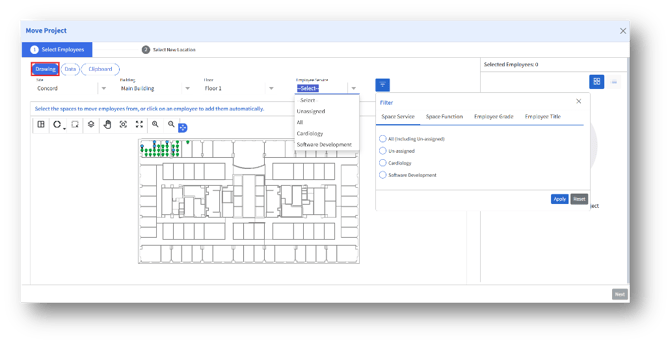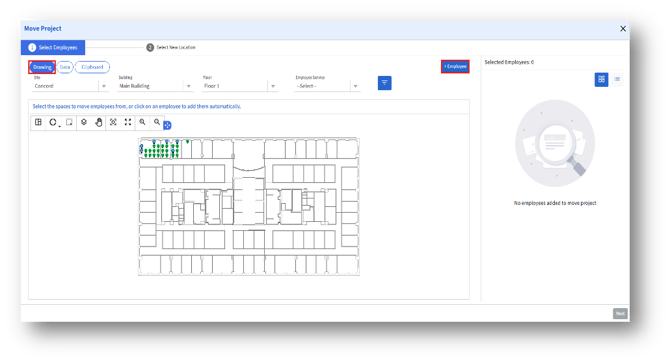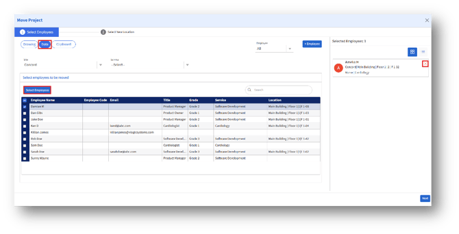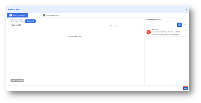Once employees are selected, the user can click the “Next” button (in the bottom-right corner) to proceed to Step 2: Select New Location, where the selected employees will be assigned to their new seats.