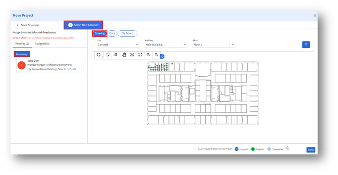 2. Manual Assignment – the user can drag and drop the employee onto a new seat in the drawing or click a seat to assign.