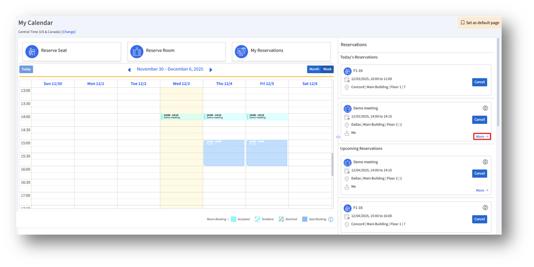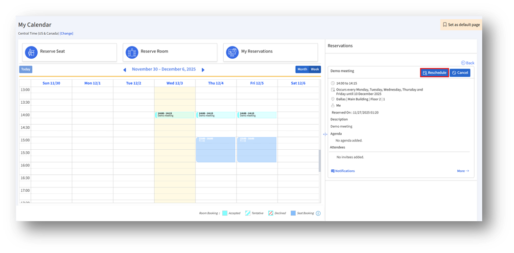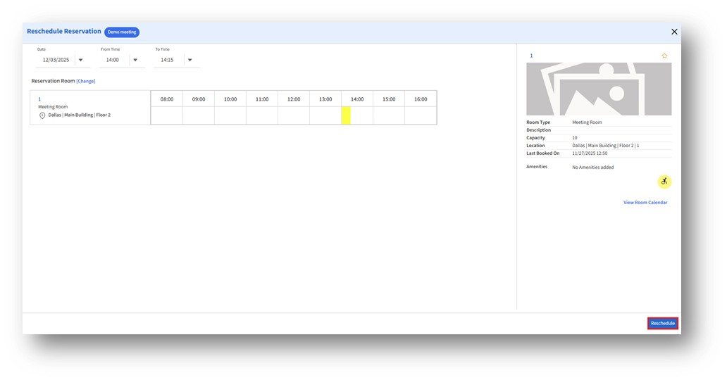Room reservations can be rescheduled directly from the calendar or through the reservation details panel. Follow the steps below to update the meeting date or time.