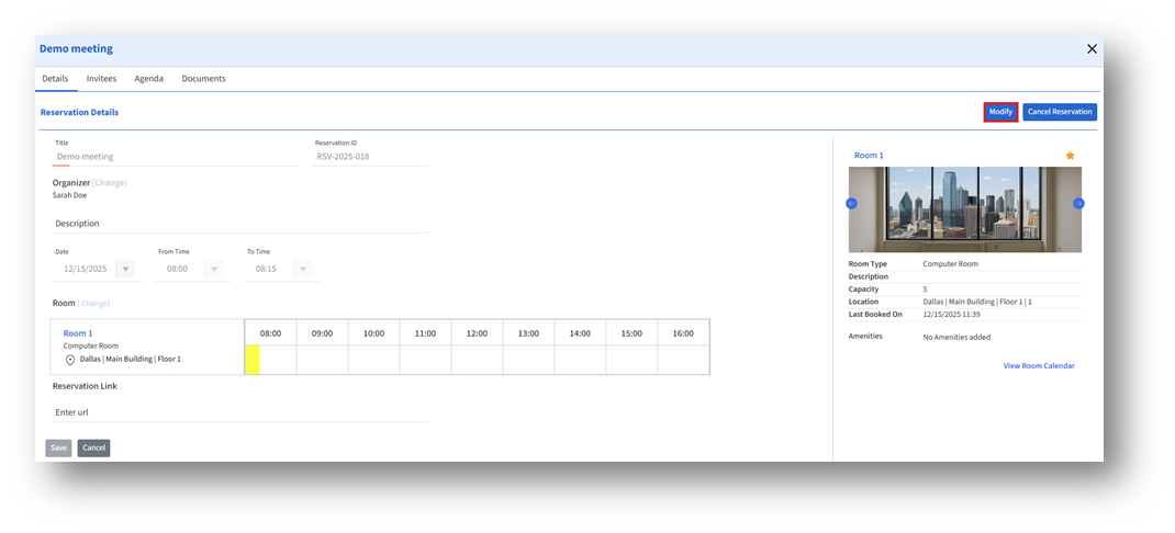 Select Modify to switch the reservation into edit mode and enable rescheduling.