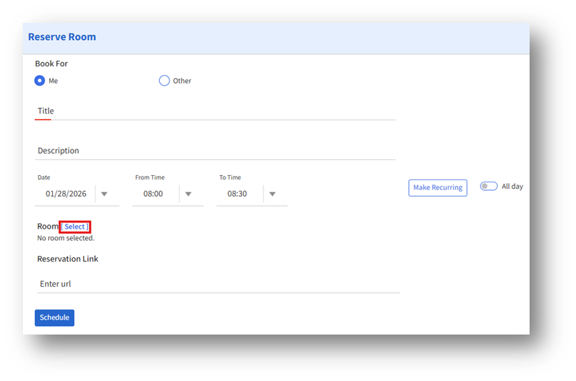 Select Me under Book For to reserve a room for your own use.