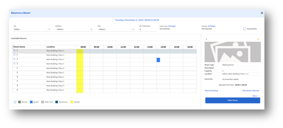 - A room will be selected by default, and you can choose any available rooms and review their availability.