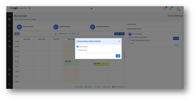 You can create reservations directly from the Calendar view on the My Calendar page for quick, efficient booking. Follow the steps below to schedule either a seat or a room reservation.