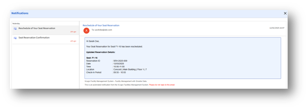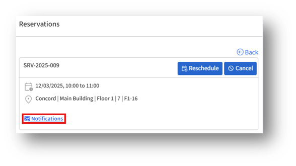 The Notifications feature lets you easily review all alerts for your seat and room reservations — including confirmations, updates, and reschedule notices. This helps you stay informed about changes to your bookings at any time.