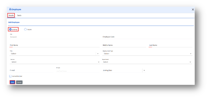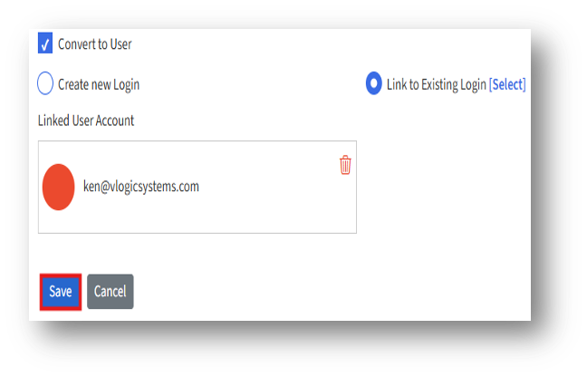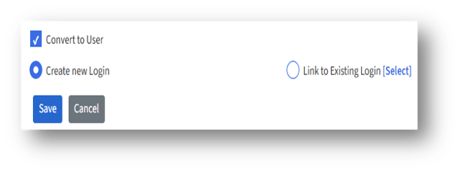 c. Convert to User – This checkbox grants the employee system login access. When selected, the login configuration options become available, and the E-mail field above becomes mandatory.