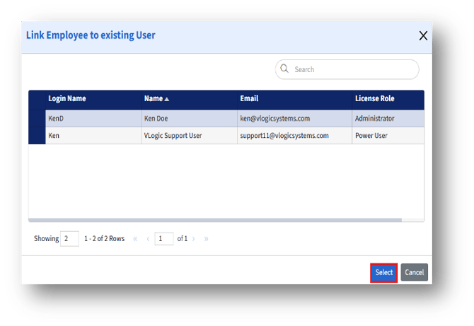 e. Link to Existing Login – Choose this option to link the employee record to an already existing system login. Clicking the Select button will open the “Link Employee to existing User” page.