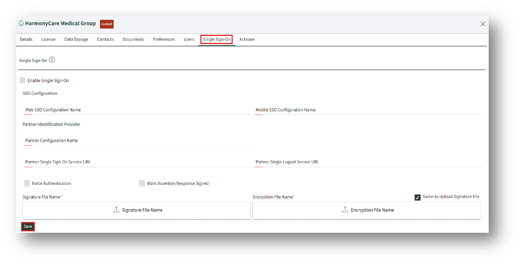 How to Configure Single Sign-on (Optional) Single Sign-on method 1. Check the “Enable Single Sign-On” checkbox to enable the configuration form. 2. Enter the details under SSO Configuration and click the Save button to save the configurations.