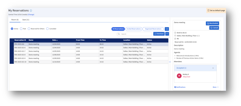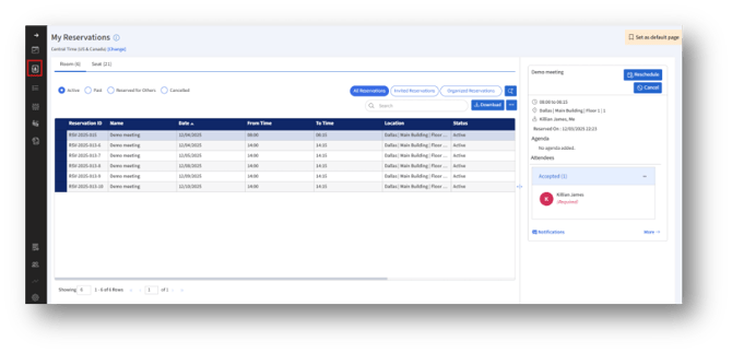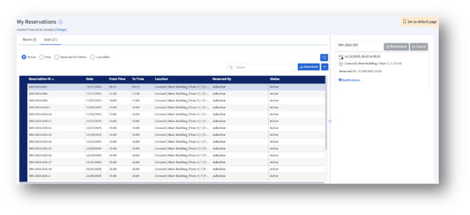 My Reservations page provides a centralized view of all your seat and room reservations. You can track upcoming bookings, review past or cancelled reservations, and manage each reservation directly from this page.
