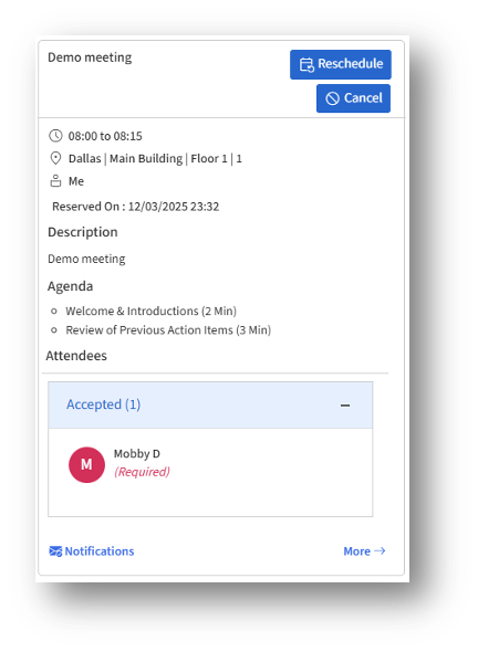 Opens the full Reservation Details page with additional tabs (Agenda, Documents, Invitees, Recurrence, etc.)