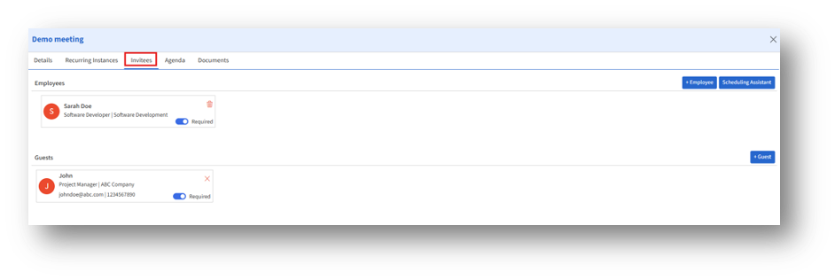 The Invitees tab allows organizers to add both internal employees and external guests to a room reservation. This ensures that all participants receive updates and notifications about the meeting.