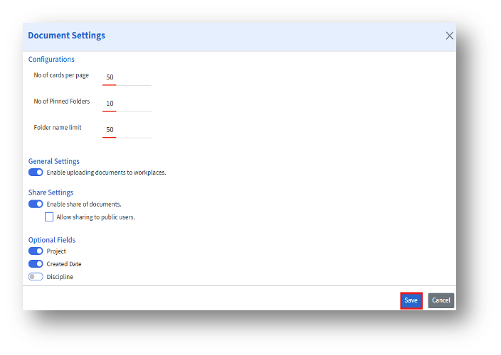 The “Document Settings” page allows admins to define how documents are managed, displayed, and shared within the system.