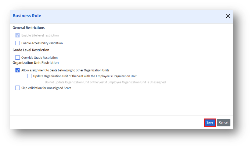 When enabled, this restriction ensures that employees can only be assigned to seats within their assigned Site. |