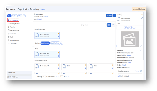 F. Sort by – The admin can sort the document view by “Last Accessed” or “Modified Time” and use the arrow icon to toggle between ascending or descending order.