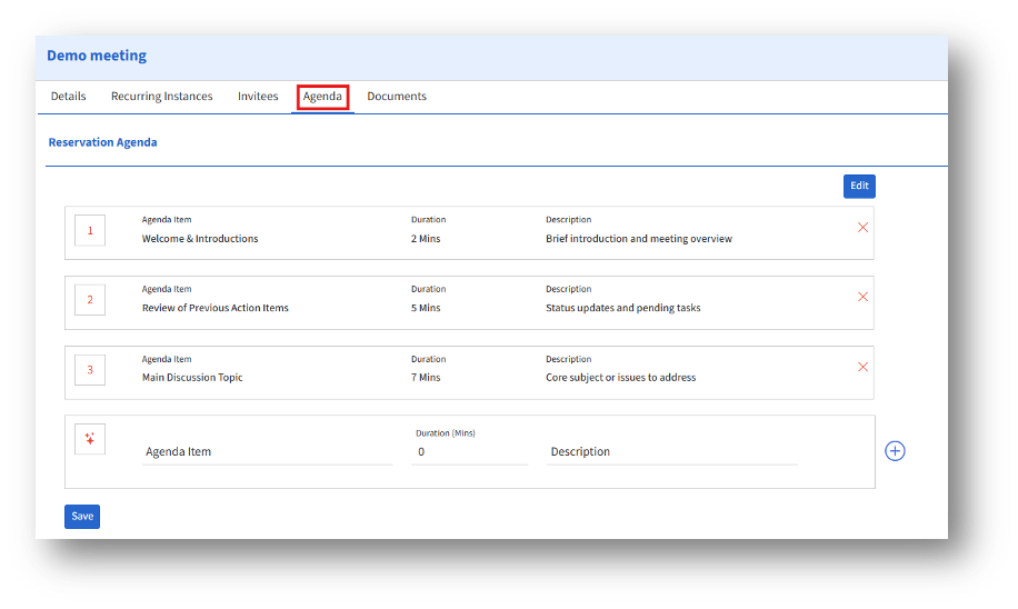 1. Add agenda items with title, duration, and description.