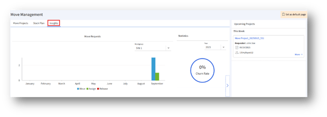The Insights tab consolidates historical, current, and future data about move management activities. It combines a timeline-based graph of move requests, churn rate analytics, and upcoming projects to give a comprehensive overview of workplace mobility trends.